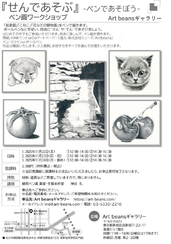 | 場所 | Art beansギャラリー 東京都新宿区西新宿7-22-11金重ビル1階B TEL:03-5330-2210 丸ノ内線「西新宿駅」徒歩4分 JR「新宿駅」徒歩10分 |