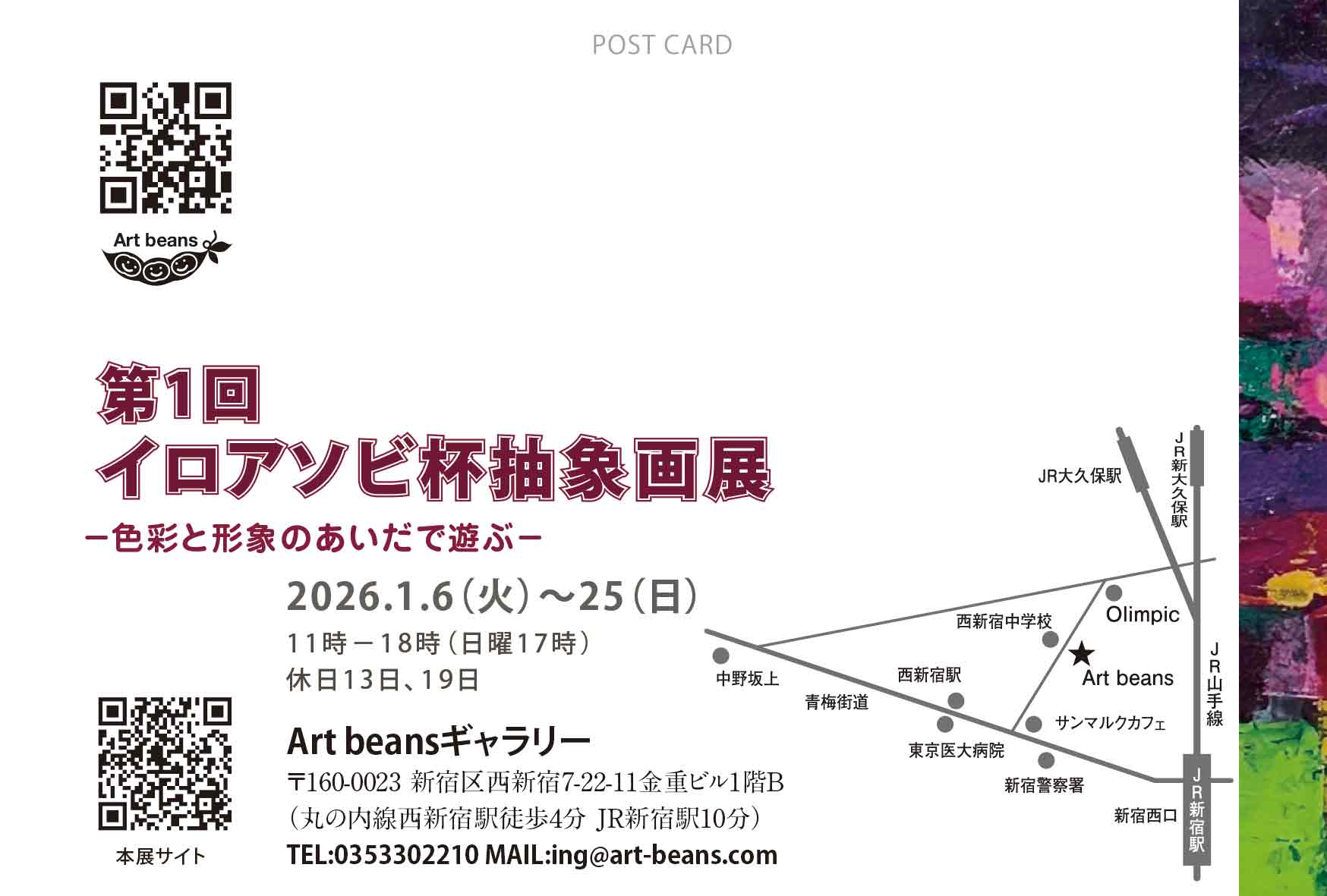 絵とうつわのアートギャラリーArt beansは青梅街道から少し入った西新宿中学校校門前の閑静な道沿い1階、新宿駅から10分西新宿駅はから4分ととても便利です。